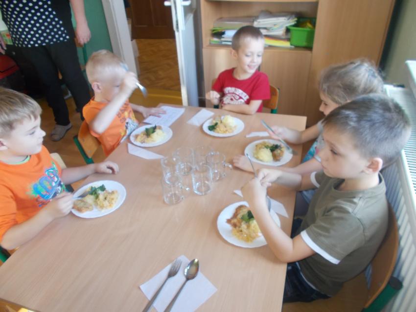 Dzieci podczas zajęć poznawały zdrowe produkty oraz potrawy, które można z nich przygotować. Poznawały zasady racjonalnego odżywiania się i dowiedziały się o konieczności jedzenia warzyw i nabiału. Brały udział w licznych zabawach i konkursach a także w przygotowywaniu koktajlu owocowego.