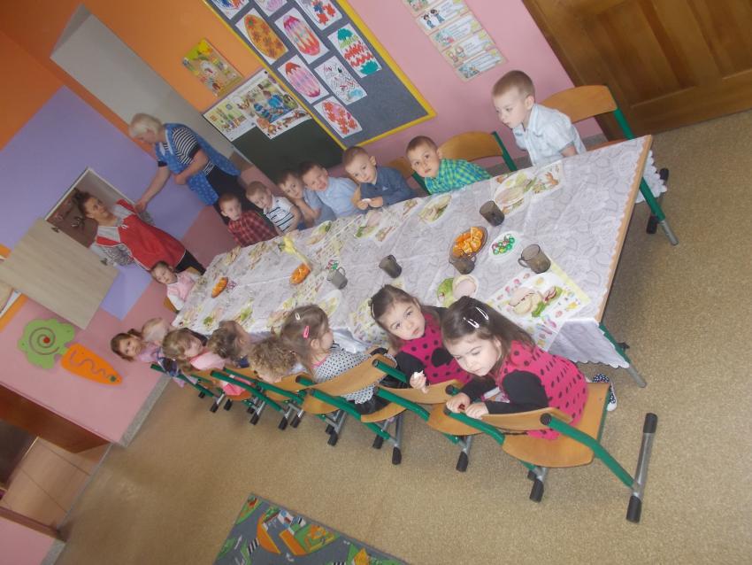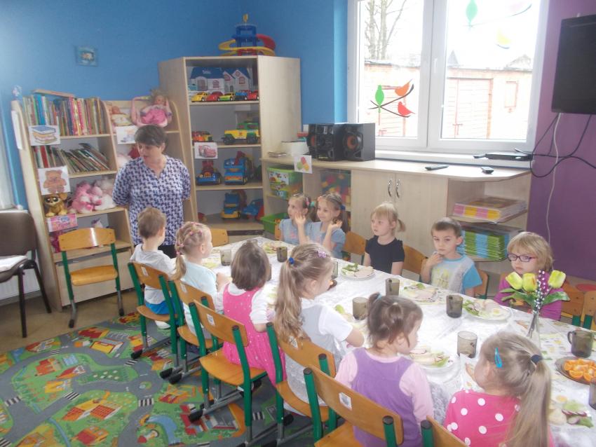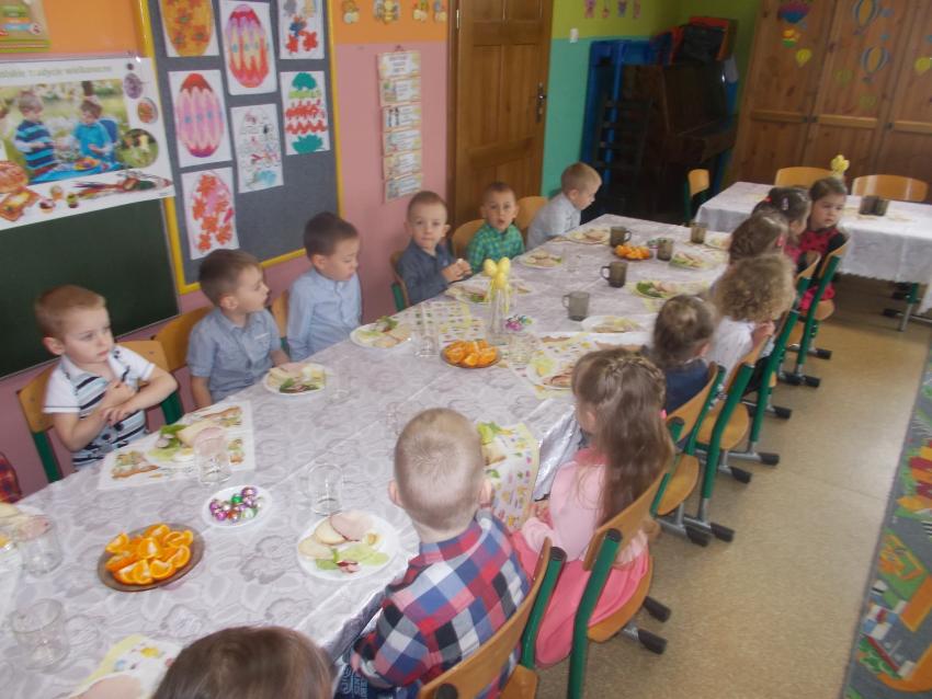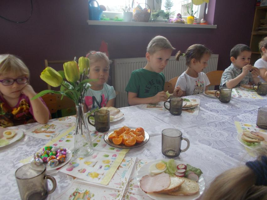 Również w przedszkolu rodzinnie spędziliśmy święta. W Wielki Czwartek urządziliśmy uroczyste śniadanie wielkanocne. Na świątecznym stole nie mogło zabraknąć jajka, białej kiełbasy, ,, baby wielkanocnej”, stroików z bazi i bukszpanu - symboli budzącej się do życia przyrody. O znaczeniu pokarmów, jako symbolach świątecznych, dzieci dowiedziały się wcześniej na zajęciach od swoich nauczycielek. Przed rozpoczęciem wspólnego śniadania złożyliśmy sobie ciepłe życzenia.