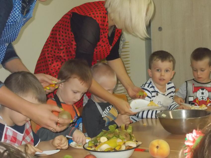 Dzieciaki uwielbiają naśladować dorosłych, zwłaszcza kochają bawić się w gotowanie, dlatego w naszym przedszkolu staramy się często organizować zabawy kulinarne. Dzieci w tym roku szkolnym robiły sałatkę owocową, produkowały najprawdziwszy sok marchewkowo - owocowy, były też jesienne kanapki oraz sałatka warzywna. Teraz dzieci z niecierpliwością oczekują świątecznych pierniczków.