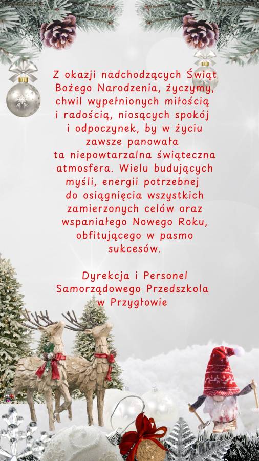Dnia 18 grudnia w sali OSP w Przygłowie odbyły się Jasełka w wykonaniu naszych Przedszkolaków. Na uroczystość przybyli zaproszeni goście, Burmistrz Gminy Sulejów Pani Dorota Jankowska, Dyrektor Biura Jednostek Oświatowych Pani Sylwia Ogłoza, Przewodniczący Rady Miejskiej Pan Rafał Kulbat, Radny Rady Miejskiej Pan Szymon Leszto, Sołtys Przygłowa Pan Tomasz Gucwa, Prezes Ochotniczej straży Pożarnej w Przygłowie Pan Bogdan Pietrykowski oraz Rodzice. Przedstawienie wprowadziło nas w świąteczny klimat, dostarczyło  niezapomnianych wrażeń i wielu wzruszeń. Z całego serca dziękujemy Rodzicom za przygotowanie sali oraz poczęstunku.
