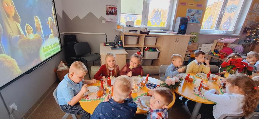Ostatni dzień w przedszkolu przed przerwą świąteczną to wspólny Obiad Wigilijny. Czas w którym wszystkie przedszkolaki siadają do wspólnego stołu, składają życzenia i śpiewają kolędy.