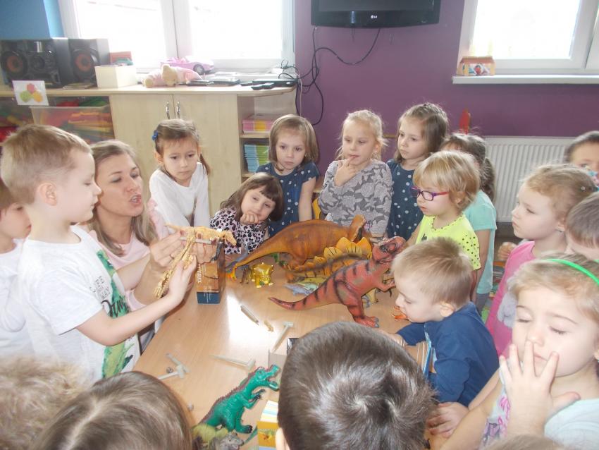 Grupę krasnoludków odwiedził starszy przedszkolak aby pokazać najmłodszym swoją kolekcję dotyczącą dinozaurów i ich świata. Mateusz bardzo się postarał żeby zaciekawić swoją wiedzą inne dzieciaki, co mu się udało. Maluchy z zaciekawieniem słuchały i oglądały eksponaty. Było to bardzo ciekawe zajęcie i pełne przeróżnych ciekawostek. Maluchy serdecznie podziękowały Mateuszowi, który wykazał się ogromną wiedzą.
