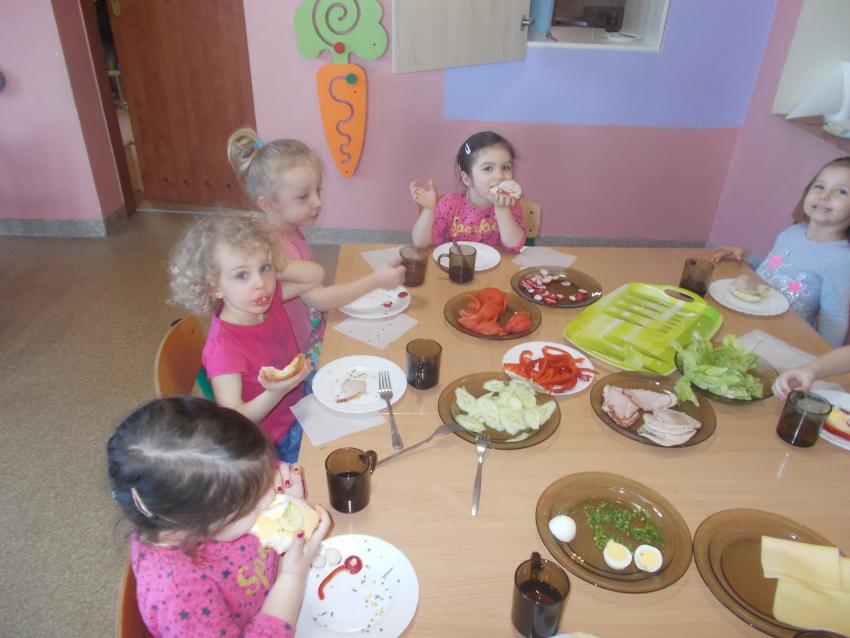 We wtorek 28.03.2017r. w naszym przedszkolu wiosna zagościła na dobre. Zajęcia kulinarne wiosną, to sama przyjemność! W sali ,,KRASNOLUDKÓW’’ unosił się zapach szczypiorku i warzyw: sałaty, pomidorów, ogórków, papryki i rzodkiewki. Maluszki podjęły wielkie wyzwanie pod hasłem ''Robimy zdrowe kanapki". Świeże warzywa, sery, pieczywo to doskonałe produkty, które świetnie smakują i mają mnóstwo witamin. Dzieci samodzielnie lub z niewielką pomocą dorosłych smarowały, kroiły, układały produkty tworząc na kanapkach fantazyjne wzory. Kanapeczki były bardzo kolorowe, smaczne a dzieci bardzo zadowolone i najedzone. Pamiętajmy, że najlepiej smakują kanapki wykonane własnoręcznie. Bardzo dziękujemy rodzicom za pomoc w przygotowaniu produktów.