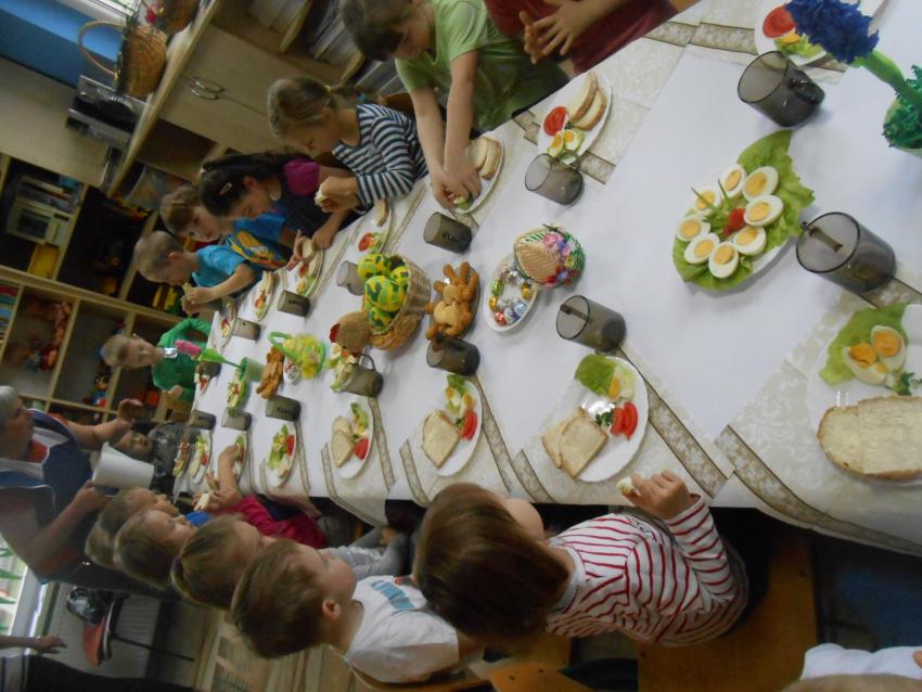 W Wielki Piątek w naszym przedszkolaku z okazji Świąt Wielkanocnych dzieci ze wszystkich grup wspólnie zasiadły do świątecznego śniadania i symbolicznie podzieliły się jajeczkiem, życząc sobie wzajemnie wesołych świąt.