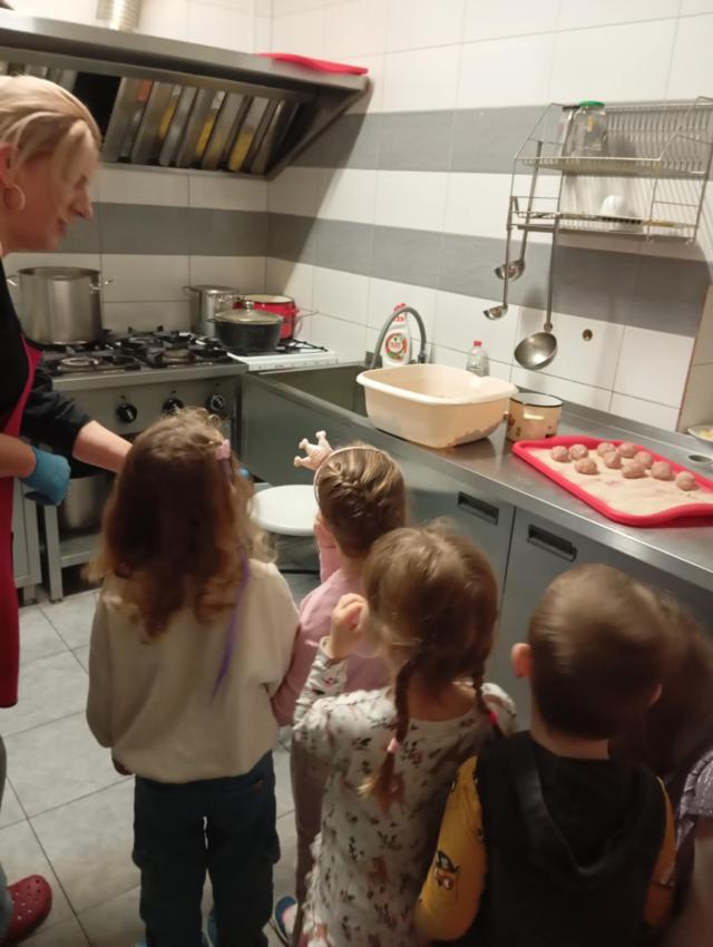 Grupa średniaków poznając zawody wybrała się do przedszkolnej kuchni. Przedszkolaki zapoznały się z pracą kucharza.