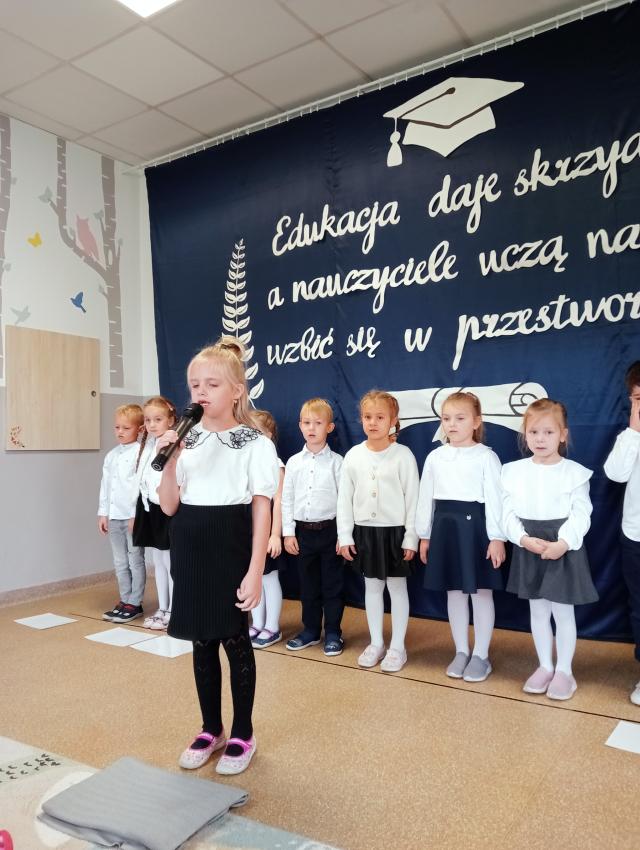 Dnia 14 października w naszym przedszkolu obchodziliśmy Dzień Edukacji Narodowej. Przedszkolaki z grupy Średniaków i Starszaków przygotowały występ artystyczny dla Pracowników Przedszkola. Dzieci życzyły nauczycielom i pracownikom oświaty wszystkiego najlepszego, samych sukcesów i zadowolenia z wykonywanej pracy.
